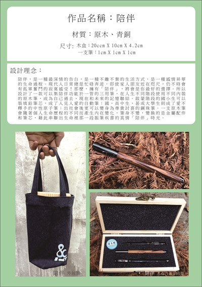 陪伴,是一種最深情的告白,是一種不離不棄的生活方式,是一種感情昇華的生命過程。現代人日常總是忙碌奔波,即使家人朋友近在咫尺,仍不時會有孤軍奮鬥的寂寞感受!那麼,擁有「陪伴」,將會是你最好的選擇。所以設計了一款可以集陪伴功能於一管的三用筆,在人生不同階段使用不同內裝的原木筆,成為自己過去、現在和未來的記憶聯結。啟蒙階段的國小生可以裝填鉛筆芯,成了人見人愛的自動筆;國、高中生,甚或大學生則成了愛不釋手的中性原子筆;出社會後更可以變身為尊貴討喜的鋼珠筆。一支原木筆會隨著個人生命歷程的不同而產生內在變化,筆身不變,變換的是金屬配件和筆芯,藉此串聯出生命裡那一段振筆疾書的真情「陪伴」時光。