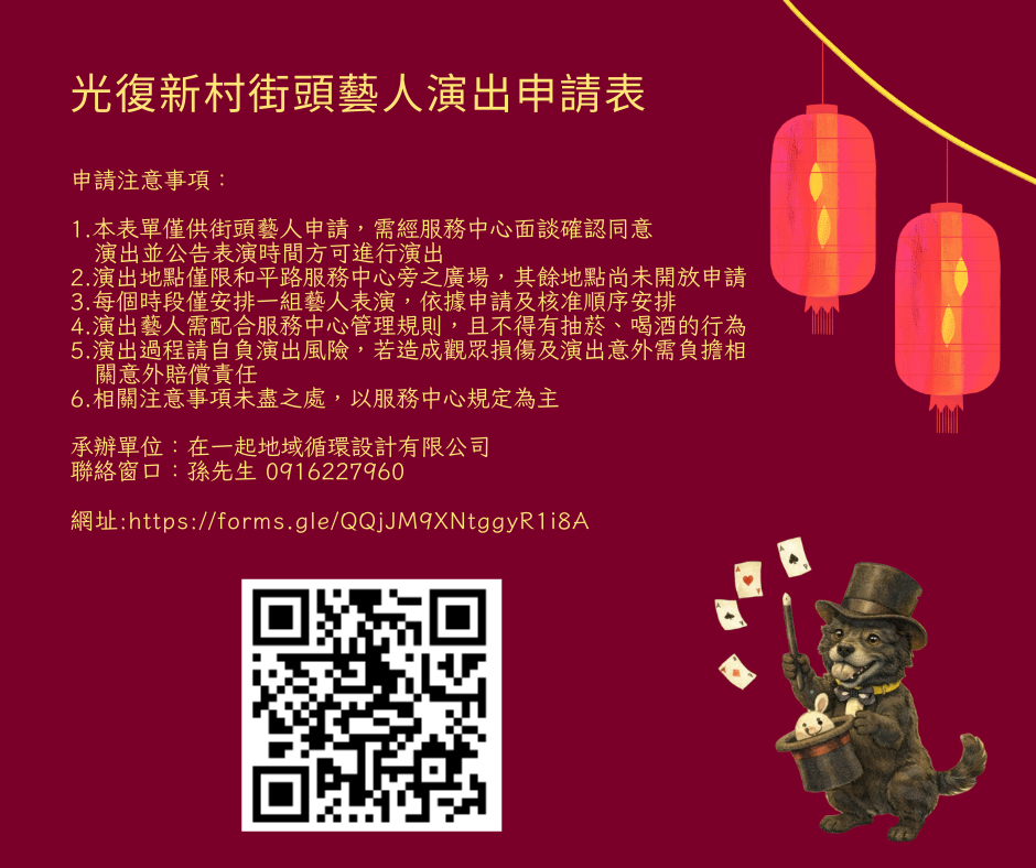 不論你是用歌聲溫暖人心的駐唱歌手、讓孩子們驚呼連連的魔術大師,或是獨具個人魅力的表演藝術家,我們誠摯邀請你來到和平路,與我們一起在眷村的暖陽下分享藝術!