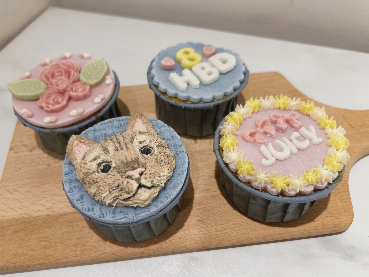 →杯子蛋糕四入,一個固定為寵物顏繪圖,其餘闆闆設計,有其他需求可提出